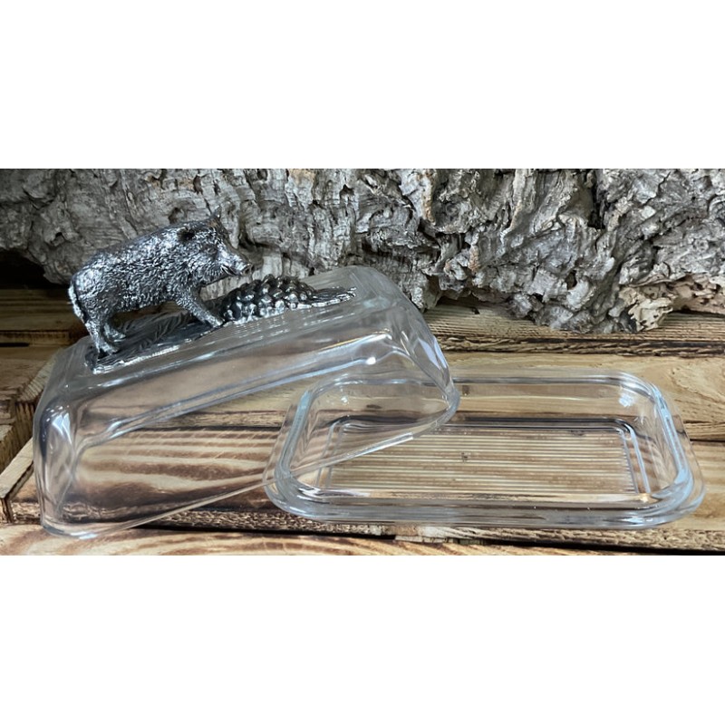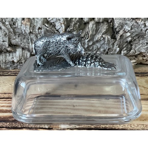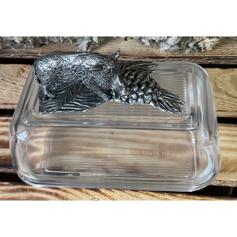 Très joli beurrier en verre avec sanglier et pomme de pin en étain sur le dessus.