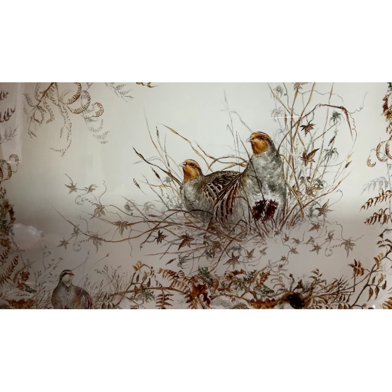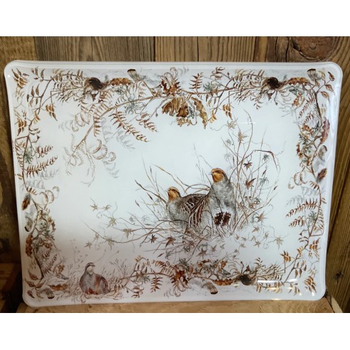 Plateau en acrylique de modèle Sologne Gien avec perdix et végétation, dimensions 28*37