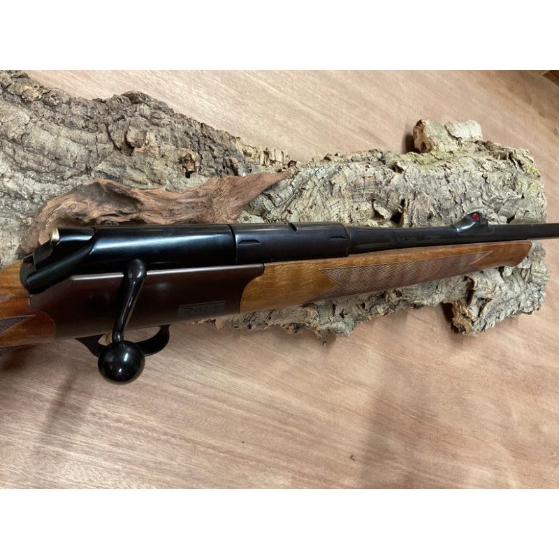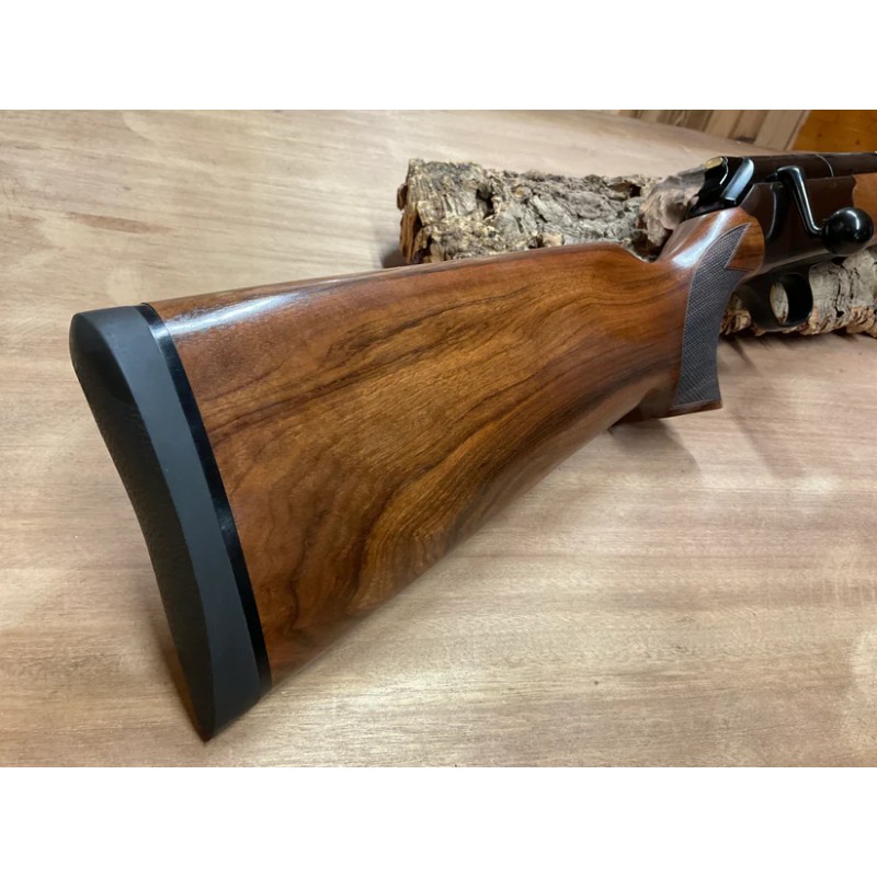 Carcasse monobloc en alliage Fortal 7075 avec anodisation de couleur bronze ou noire sur demande Crosse pistolet avec joue Monte Carlo et devant tulipe en Noyer 3 Étoiles poncé huilé Plaque de couche anti recul Levier d’armement avec boule synthétique noire Chargeur rotatif amovible Canon interchangeable avec hausse triangulaire luminescente breveté et guidon réglable en hauteur.