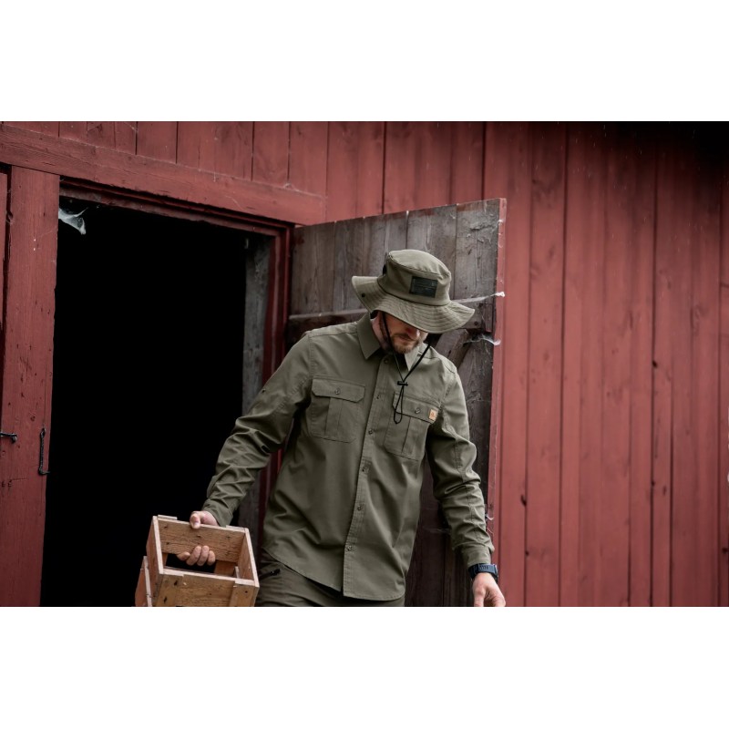 Une chemise en coton/poly/élasthanne offrant douceur, respirabilité et séchage rapide. Extensible pour une aisance totale, elle possède des manches retroussables, de grandes poches et un style inspiré du safari